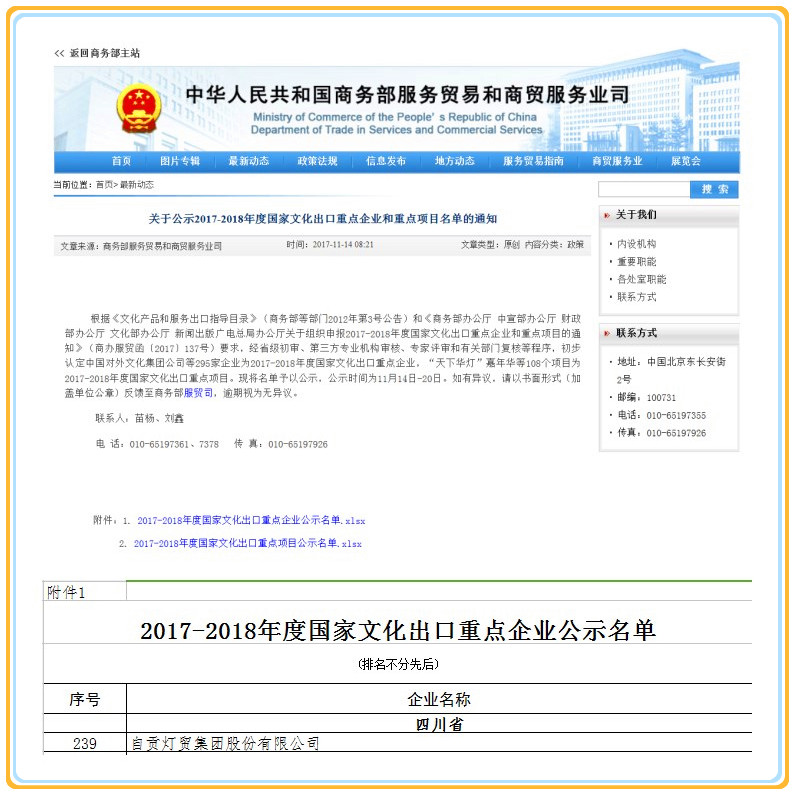 自貢燈貿(mào)集團(tuán)股份有限公司入錄“2017-2018年度國家文化出口重點(diǎn)企業(yè)”公示名目。這是自貢燈貿(mào)集團(tuán)股份有限公司自2007年以來,第六次榮獲此殊榮,也是全國彩燈行業(yè)唯一連續(xù)六屆十二年獲此殊榮的企業(yè)。