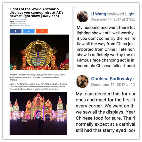 本次燈展是東方彩燈繼2016第一次成功舉辦美國菲尼克斯彩燈嘉年華的再次完美呈現(xiàn)。2017美國菲尼克斯彩燈嘉年華,自開展以來備受美國當?shù)孛癖姛崤鹾透鞔笾髁髅襟w關(guān)注、在facebook等社交平臺更是掀起了中國彩燈熱潮,菲尼克斯當?shù)匦侣劇?Now @ 6 》報道稱“2017世界之光彩燈嘉年華是北美最大的彩燈節(jié),是全球文化集合地,游客仿佛置身于迪士尼中。”
