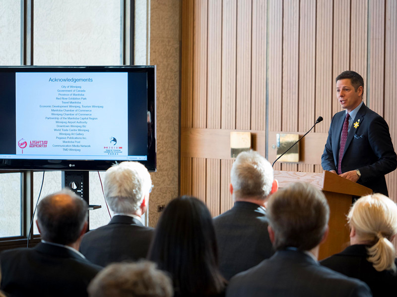 溫尼伯市市長(zhǎng)BRIAN BOWMAN發(fā)布會(huì)上誠(chéng)邀天下客,共賞東方燈,他說(shuō):“北境之光——溫尼伯中華彩燈嘉年華”是“2018中加旅游年”的重頭戲,我們非常期待本次活動(dòng),屆時(shí)悠久璀璨的中華文明將帶給加拿大民眾一場(chǎng)神奇的光影之旅,也誠(chéng)摯邀請(qǐng)各國(guó)游客來(lái)溫尼伯做客。在4月5日召開(kāi)的曼省議會(huì)上專(zhuān)題介紹了本次燈展,并對(duì)燈會(huì)給予了高度評(píng)價(jià)。會(huì)上全體省議員集體起立,為燈展項(xiàng)目鼓掌一分鐘。