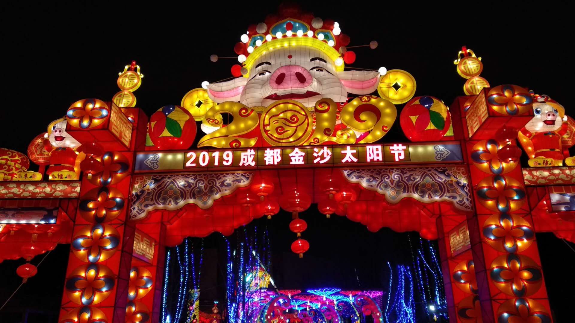 金沙太陽節(jié)史上最大的立體生肖造型,卡通豬組合燈組“金豬賜福”,向游客傳遞豬年的美好祝福?!叭朔晔⑹狼闊o限,豬拱華門歲有余”,歡樂祥瑞的金豬將福澤灑滿天府大地。