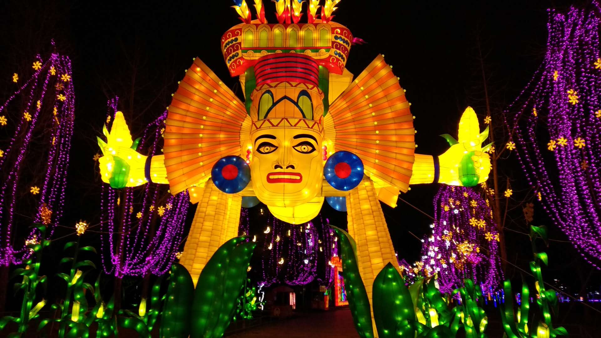 “瑪雅之光”是本屆太陽節(jié)燈組的又一大亮點。首次運用彩燈的手法,再現(xiàn)神秘的瑪雅世界,引領游人穿越時空,欣賞這一古老文明留贈現(xiàn)世之美。作為中美洲熱帶叢林中悄然萌芽卻又戛然而止的神秘文明,瑪雅的象形文字、宇宙觀念、創(chuàng)世傳說、神靈崇拜及其精神信仰都成為燈組著力表現(xiàn)的內容。
