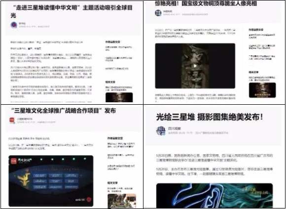截至5月29日10點(diǎn),各大主流媒體紛紛推出《光繪三星堆 攝影圖集絕美發(fā)布!》《揭開古蜀國神秘面紗 走進(jìn)三星堆體驗(yàn)博物館奇妙夜》《新出土千余件重要文物后 三星堆吸引中外媒體讀懂中華文明》《三星堆國寶文物銅頂尊跪坐人像亮相!》《“三星堆文化全球推廣戰(zhàn)略合作”9大項(xiàng)目正式發(fā)布》等新聞報(bào)道。