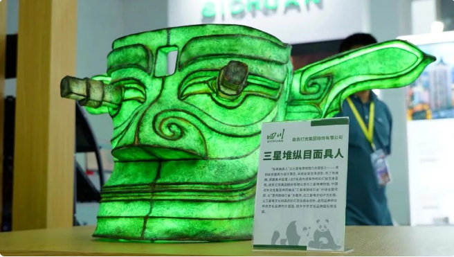 本屆青洽會中,四川館以“激情大運·魅力四川”為主題,分設(shè)“激情大運”“特色科技”“三星堆文創(chuàng)”“川貨出川”四大展區(qū)。自貢燈貿(mào)集團(tuán)股份有限公司的最新微縮彩燈工藝產(chǎn)品——“三星堆縱目面具人”亮相青洽會,攜手其他特色文創(chuàng)展品共同生動展現(xiàn)四川風(fēng)采。